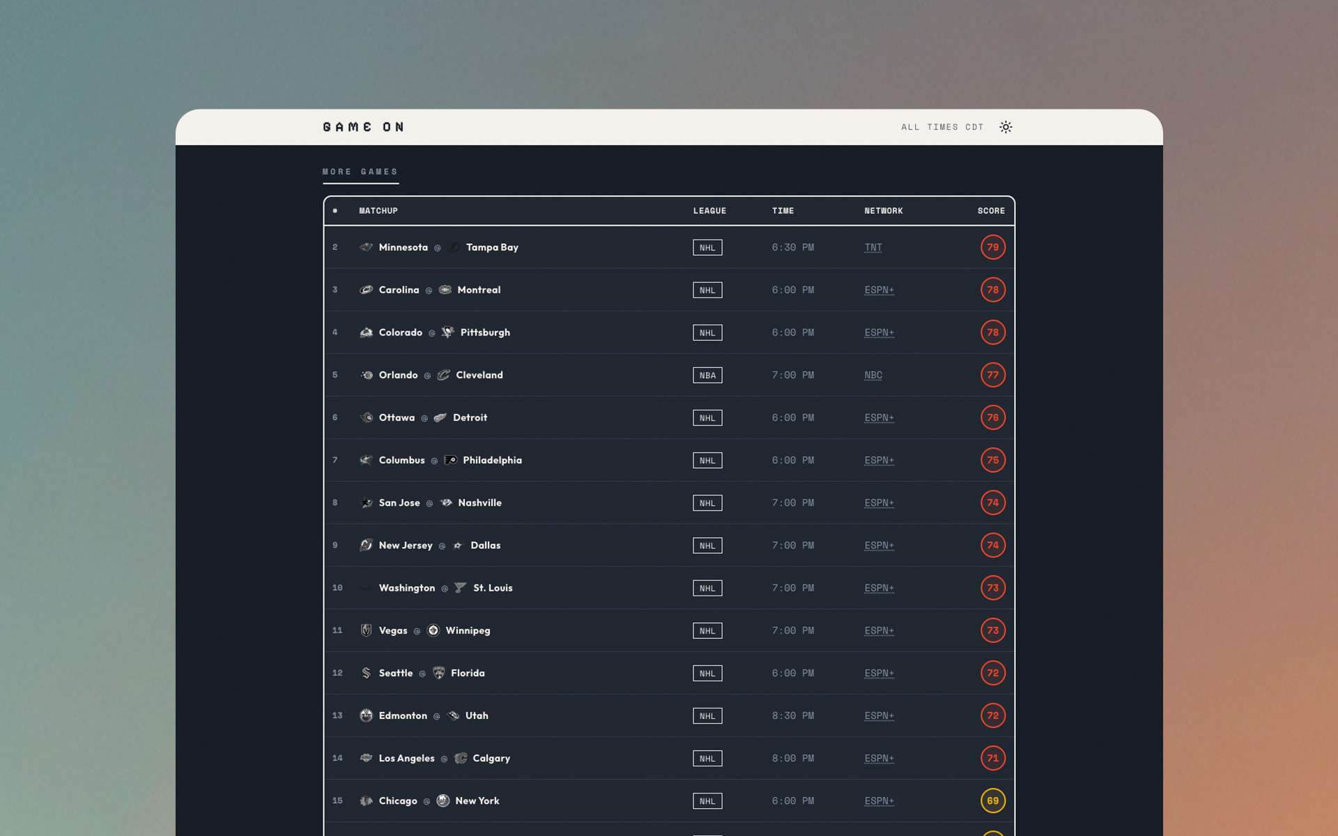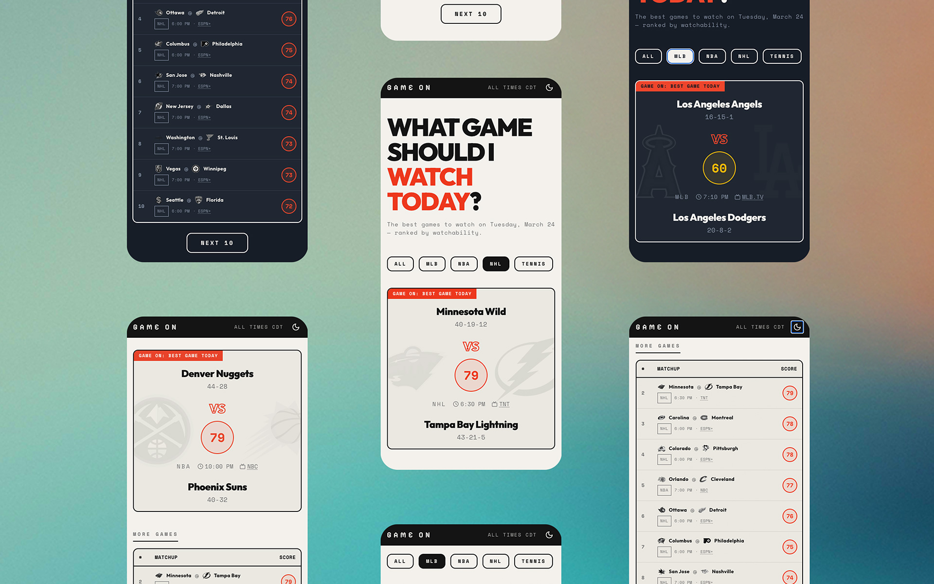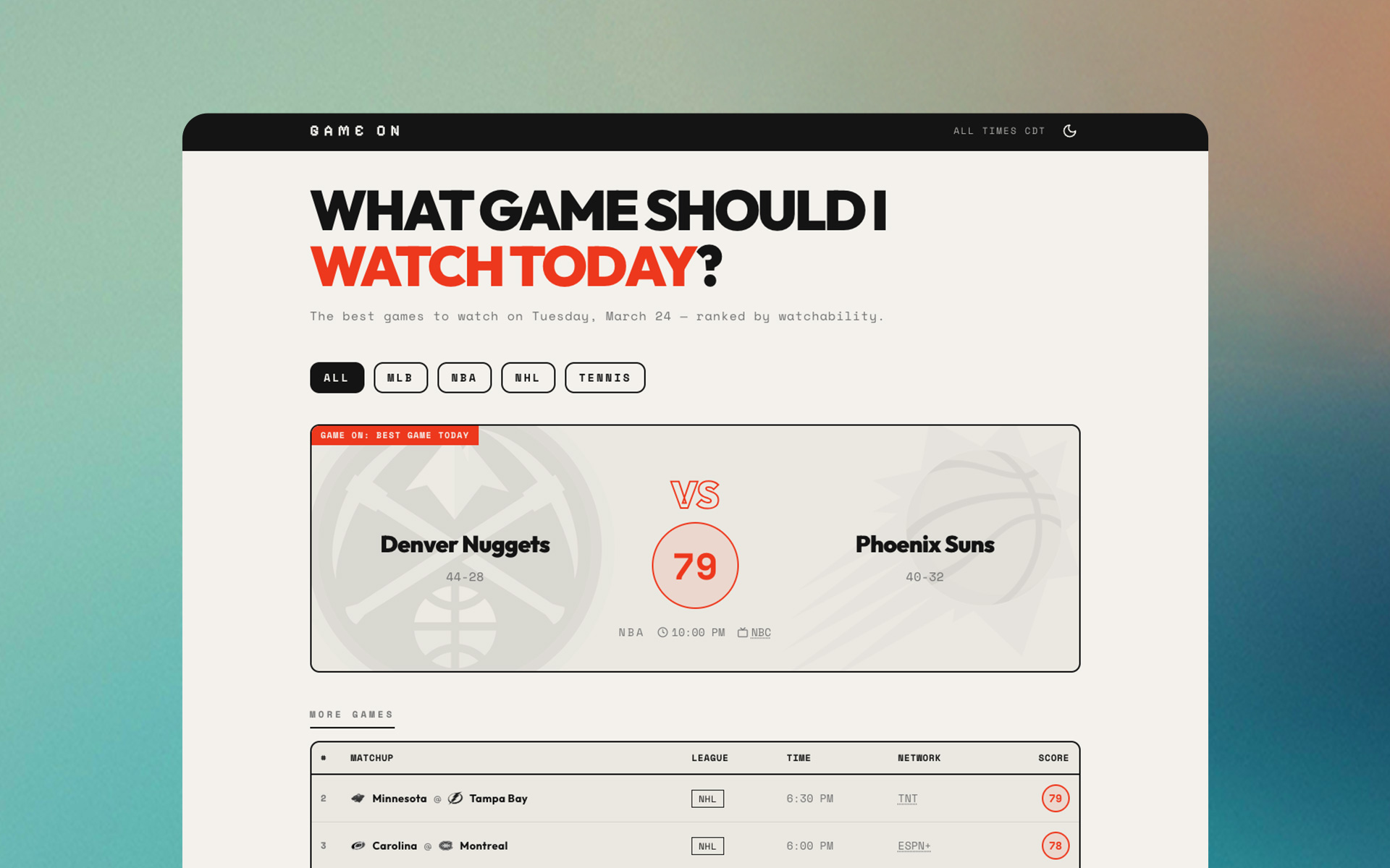 Deciding what game to watch shouldn’t take longer than the game itself. Game On ranks the day’s best matchups with a custom “watchability” algorithm, surfacing the most compelling games based on team quality, competitiveness, star power, and context. Designed and built using AI-powered tools, it turns a fragmented browsing experience into a fast, repeatable daily utility.